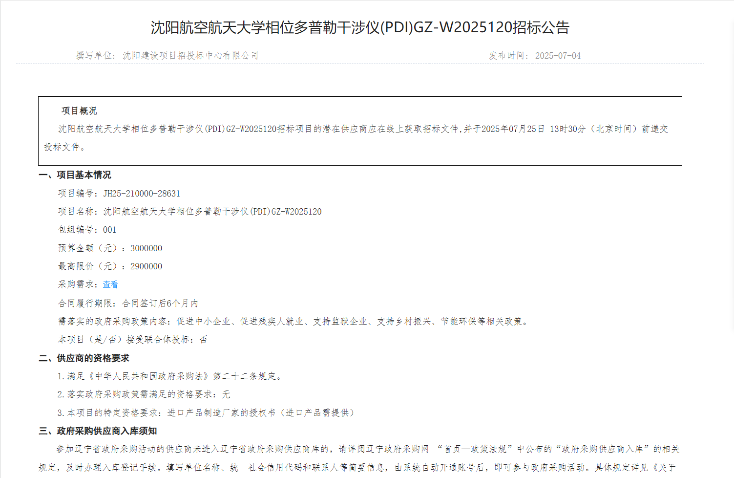 沈航相应多普勒干涉仪(PDI)GZ-W2025120招标公告(JH25-210000-28631)