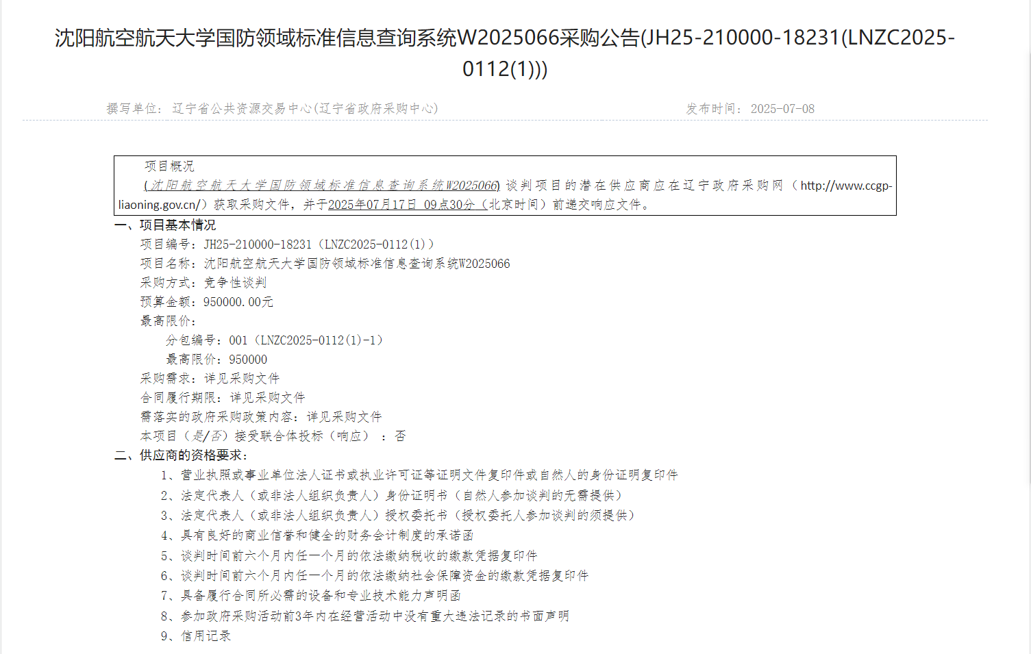 沈航国防领域标准信息查询系统W2025066采购公告(JH25-210000-18231)