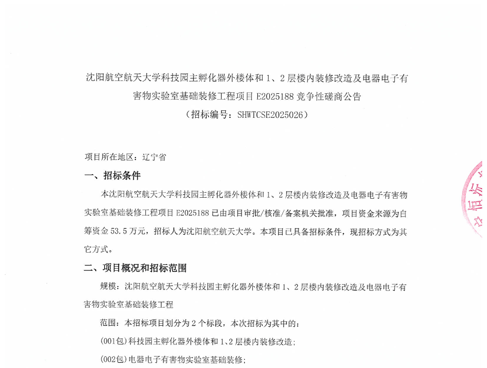 沈航科技园主孵化器外楼梯和1、2层楼内装修改造及电器电子有害物实验室基础装修工程项目E2025188采购公告(SHWTCSE2025026)