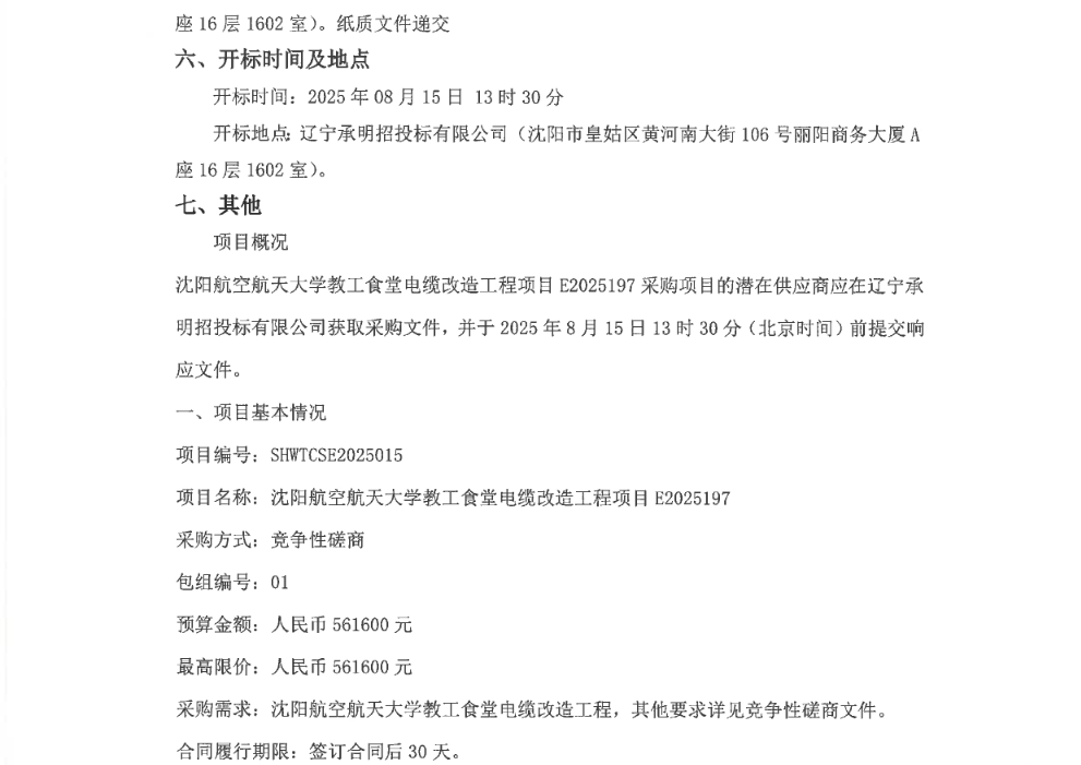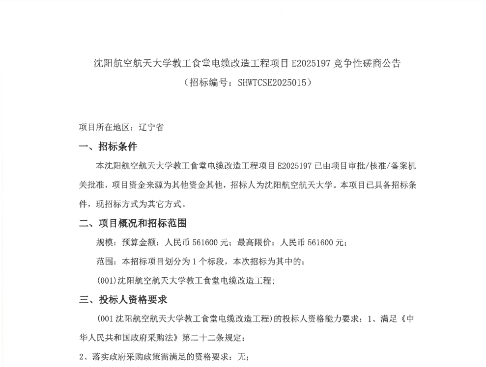 沈航教工食堂电缆改造工程项目E2025197采购公告(SHWTCSE2025015)