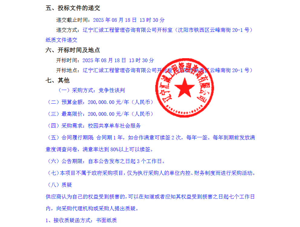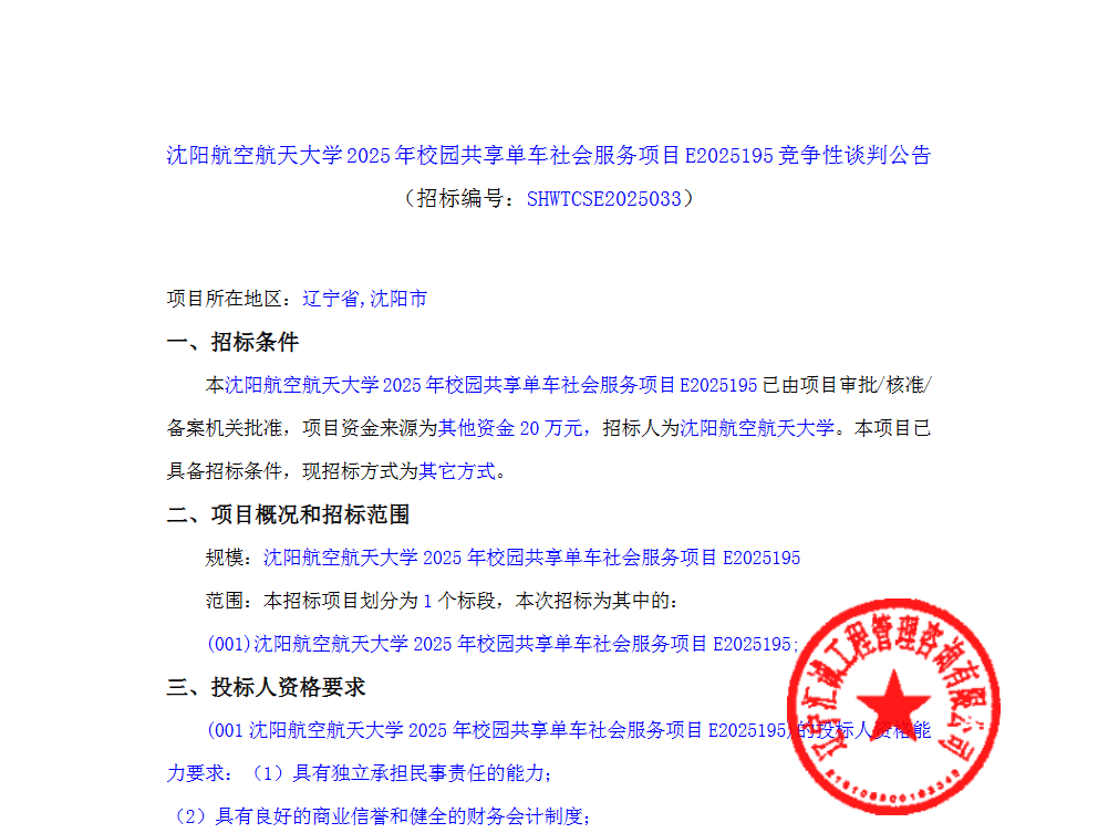 沈航205年校园共享单车社会服务项目E2025195采购公告(SHWTCSE2025033)