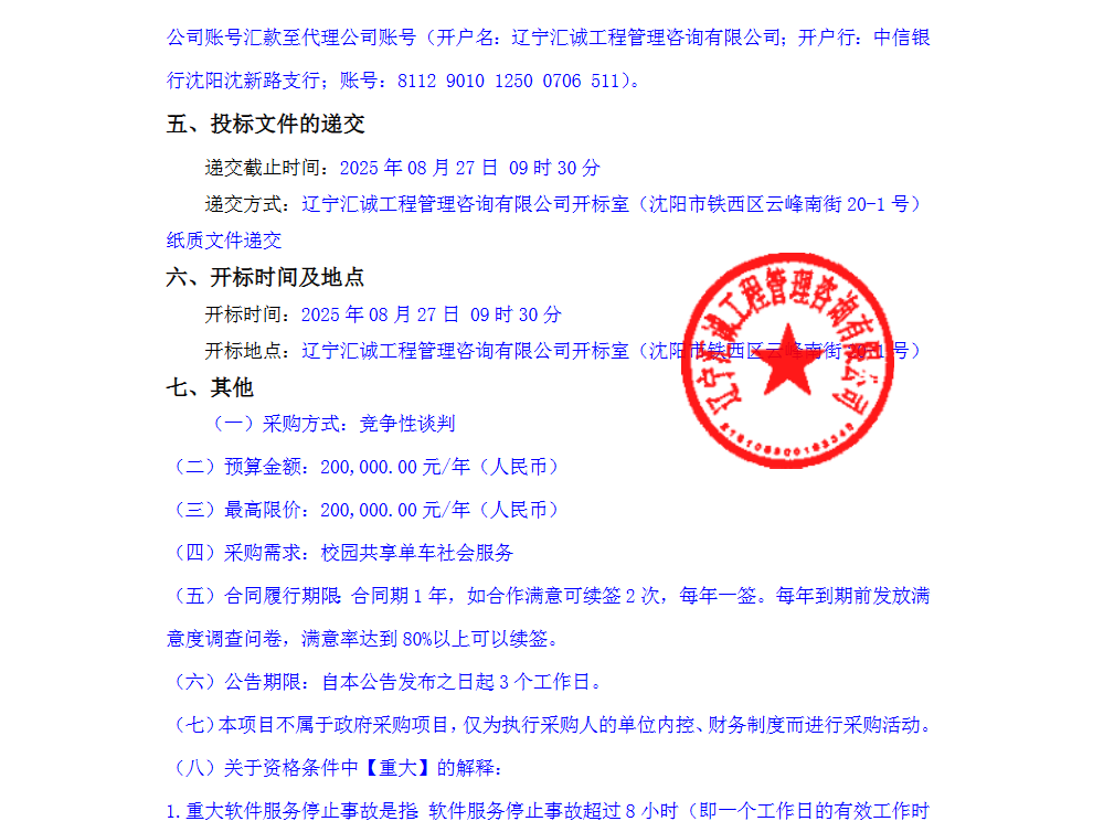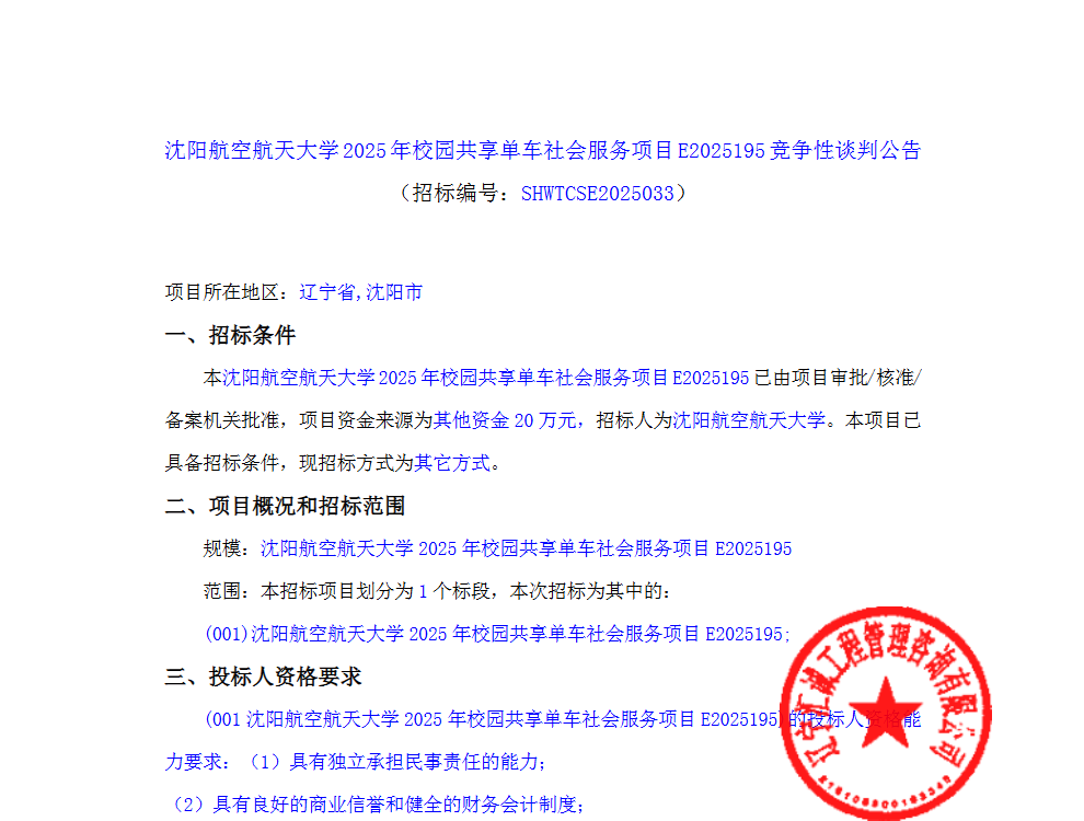 沈航2025年校园共享单车社会服务项目E2025195采购公告(SHWTCSE2025033)