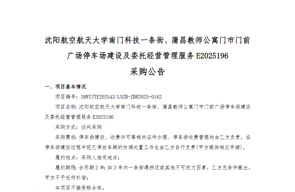 沈航南门科技一条街、蒲昌教师公寓门市门前广场停车场建设及委托经营管理服务E2025196采购公告(SHWTJTE2025043)