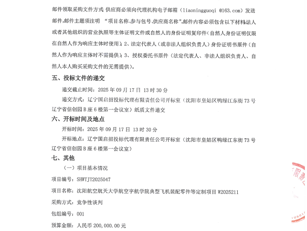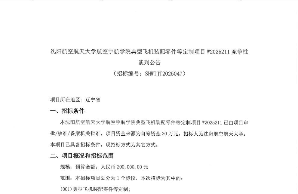 沈航航空宇航学院典型飞机装配零件等定制项目W2025211采购公告(SHWTJT2025047)