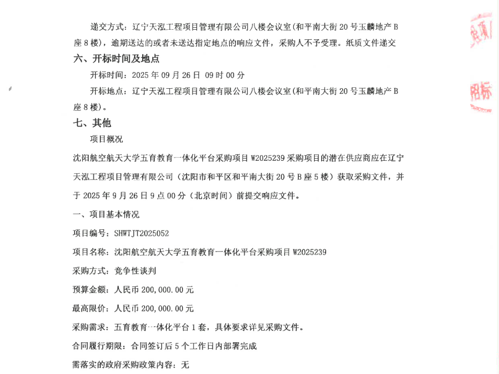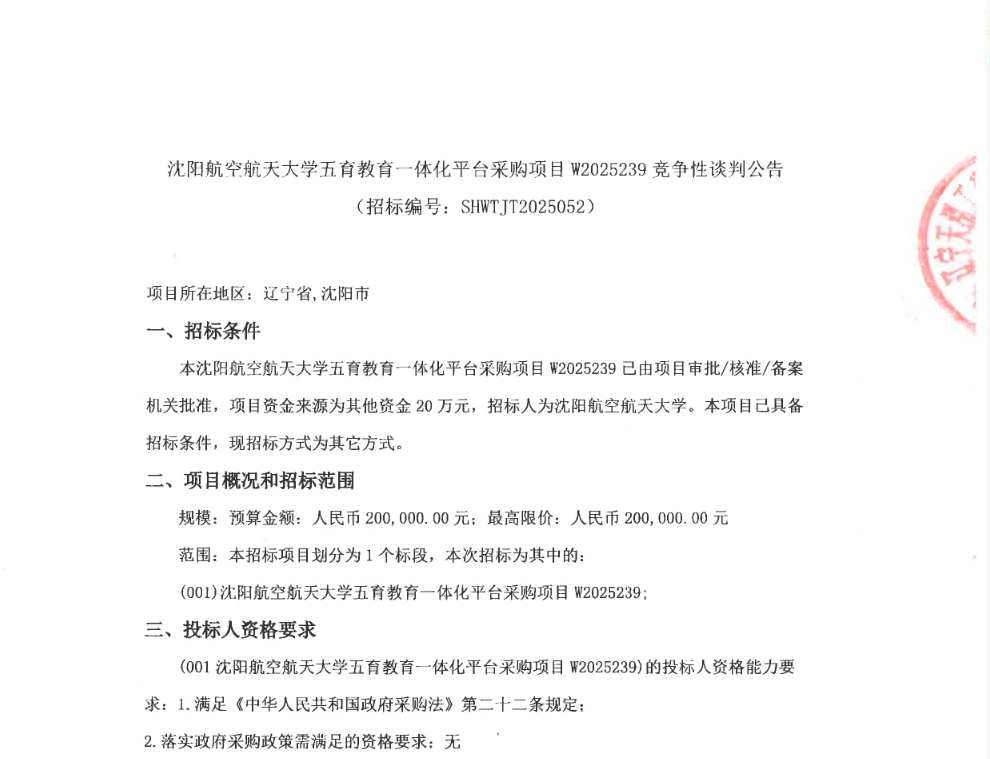沈航五育教育一体化平台采购项目W2025239采购公告(SHWTJT2025052)