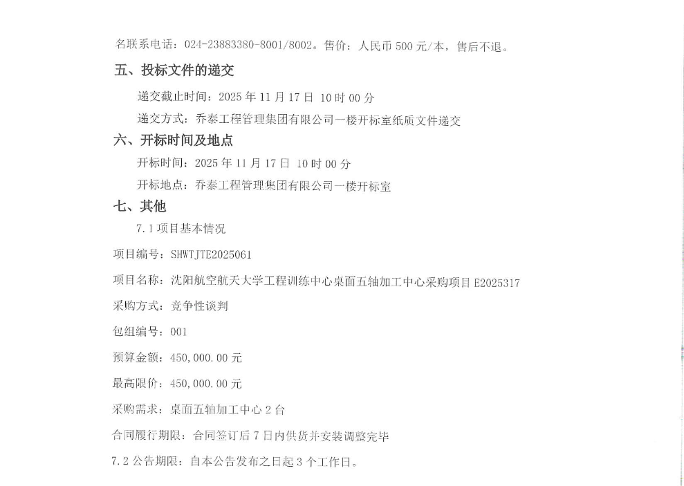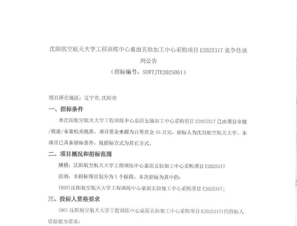 沈航工程训练中心桌面五轴加工中心采购项目E2025317招标公告(SHWTJTE2025061)