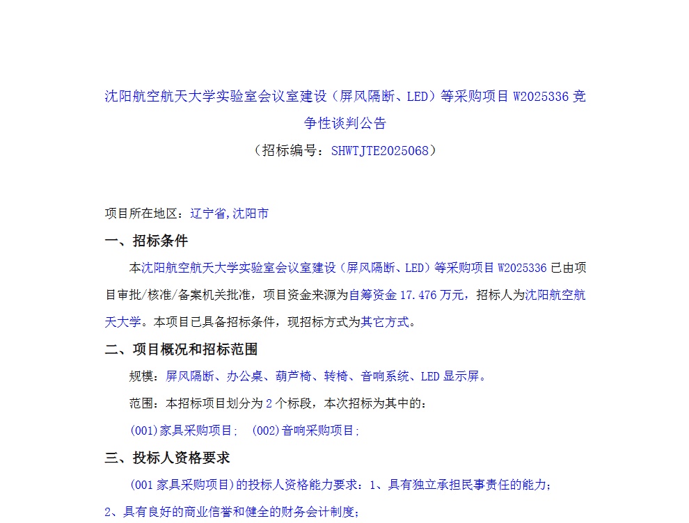 沈航实验室会议室建设(屏风隔断、LED)等采购项目W2025336招标公告(SHWTJTE2025068)