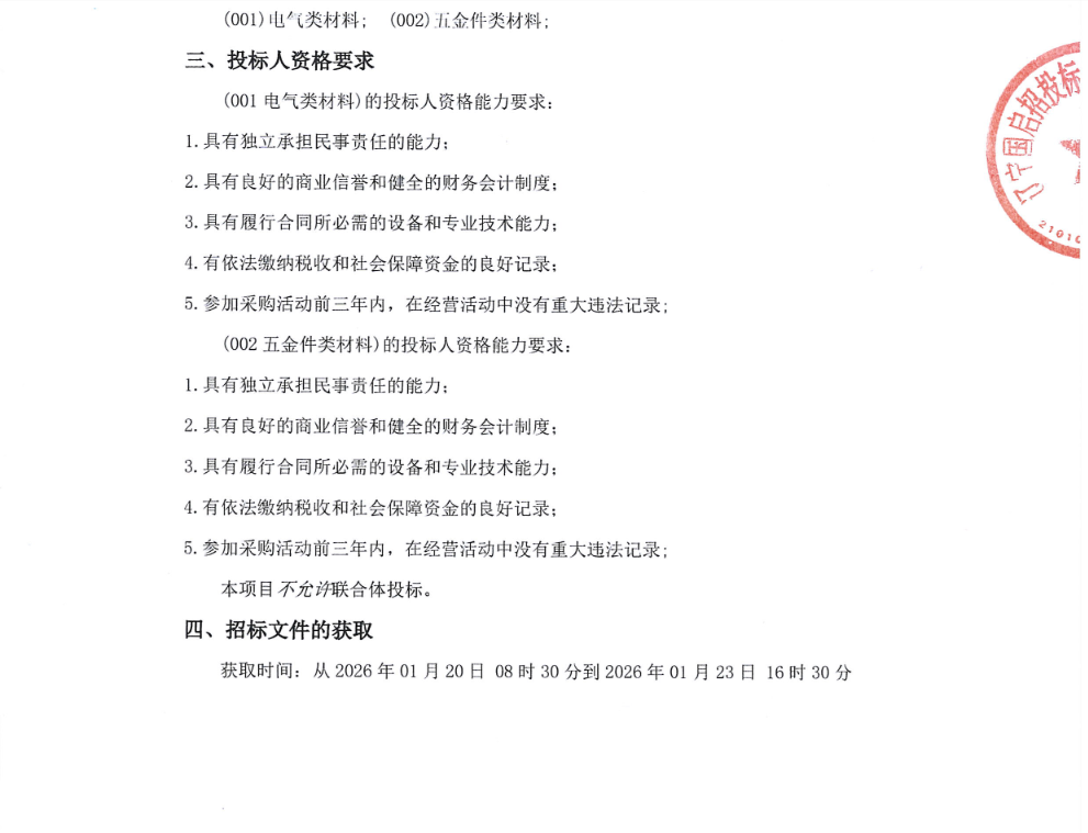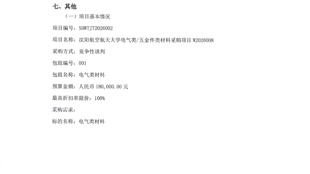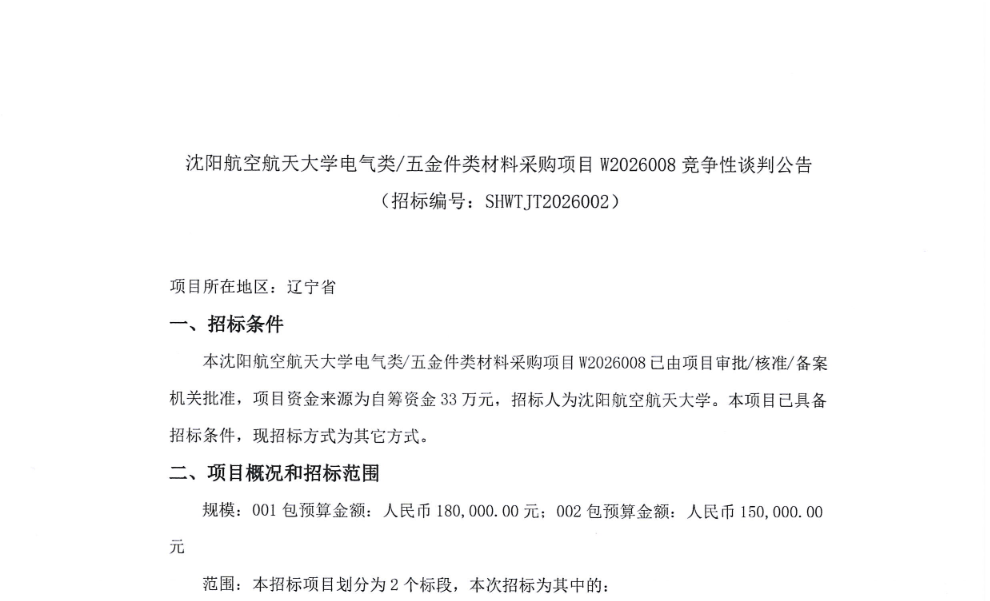 沈航电气类/五金件类材料采购项目W2026008竞争性谈判公告(SHWTJT2026002)