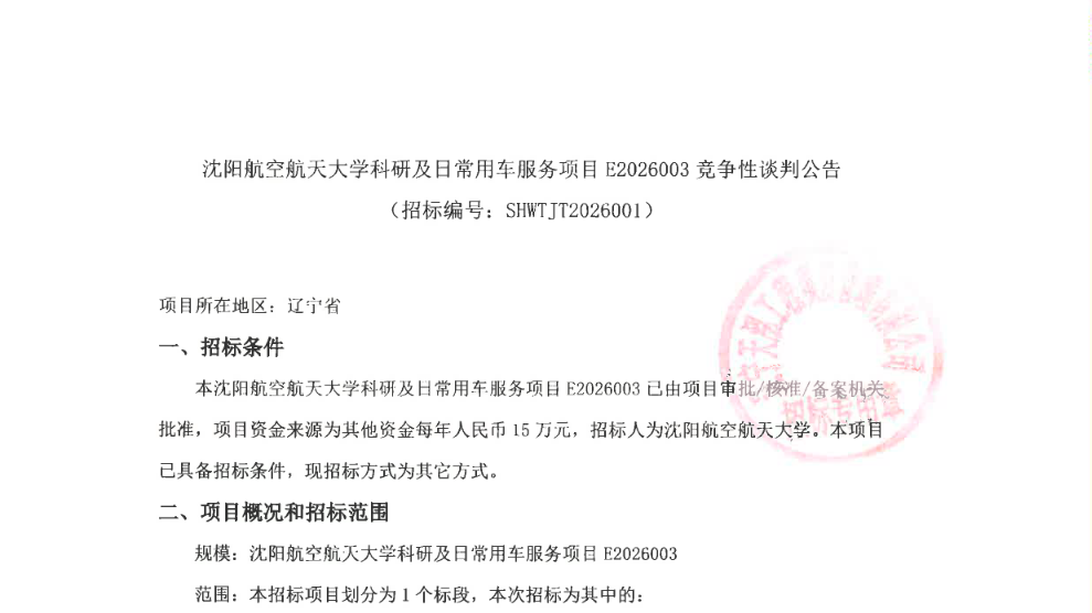 沈航科研及日常用车服务项目E202003(二次)竞争性谈判公告(SHWTJT2026001)