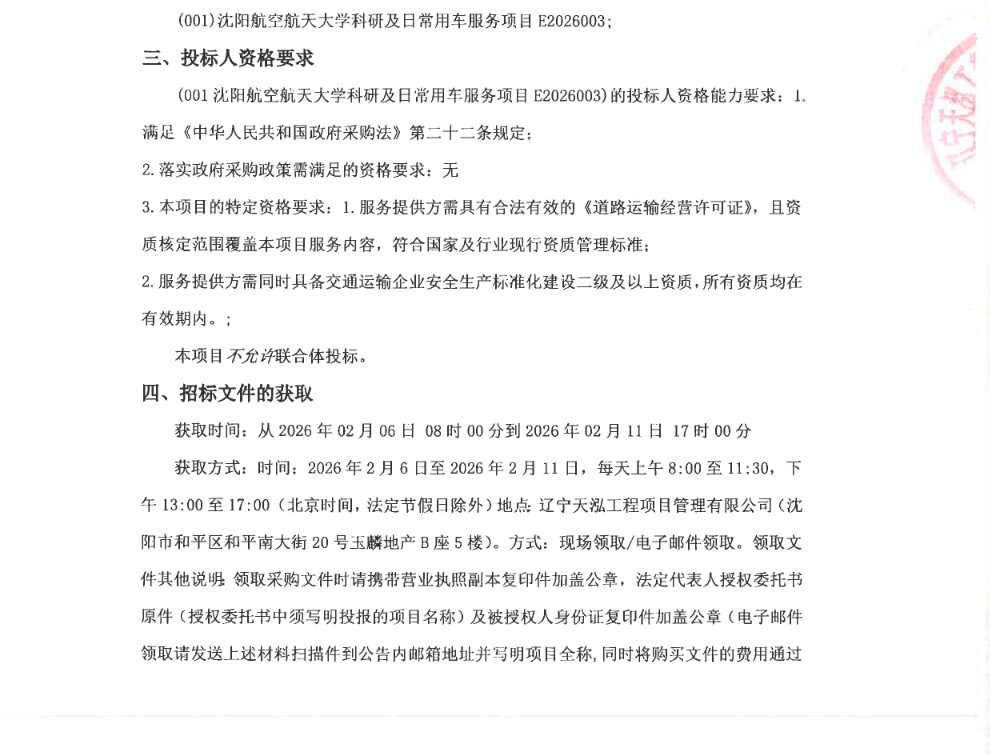 沈航科研及日常用车服务项目E2026003竞争性谈判公告(SHWTJT2026001)