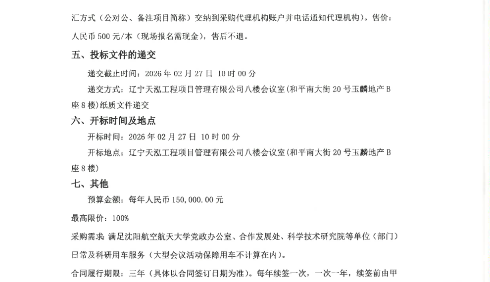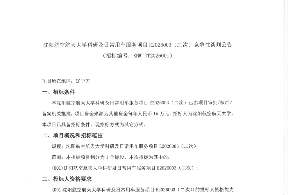 沈航科研及日常用车服务项目E202003(二次)竞争性谈判公告(SHWTJT2026001)