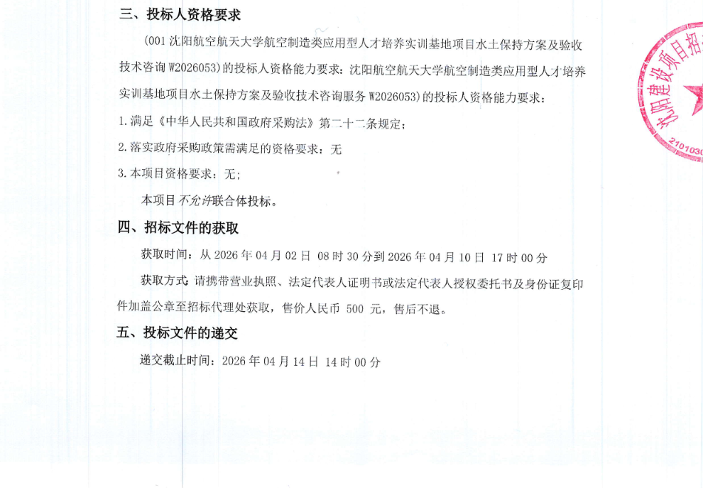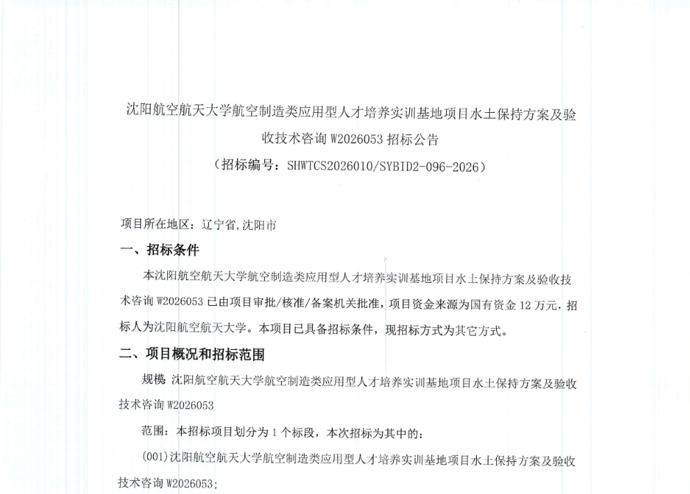 沈航航空制造类应用型人才培养实训基地项目水土保持方案及验收技术咨询W2026053招标公告(SHWTCS2026010)