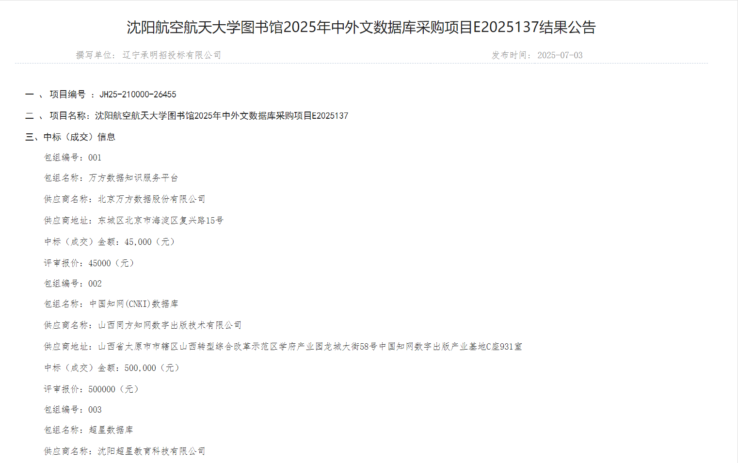 沈航图书馆2025年中外文数据库采购项目E2025137结果公告(JH25-210000-26455)