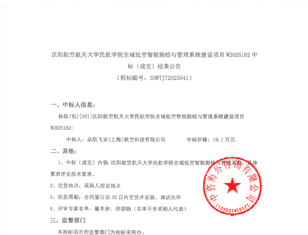 沈航民航学院全域低空智能测绘与管理系统建设项目W2025162结果公告(SHWTJT2025041)
