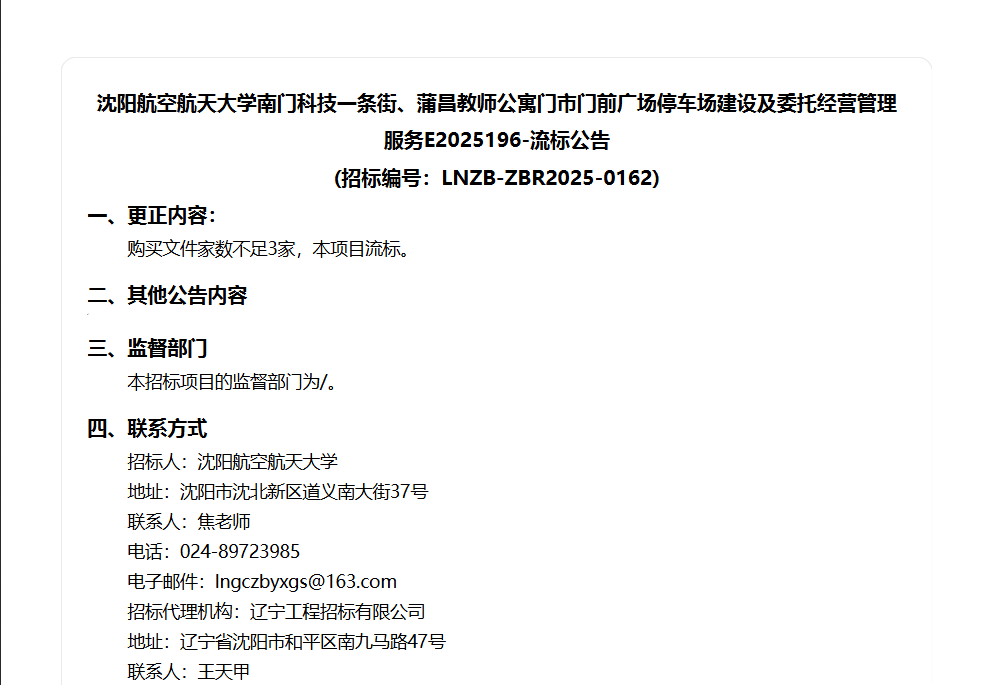 沈航南门科技一条街、蒲昌教师公寓门市门前广场停车场建设及委托经营管理服务E2025196流标公告(SHWTJTE2025043)