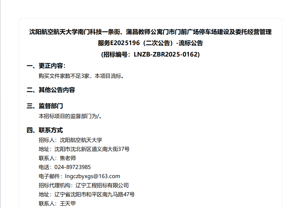 沈航南门科技一条街、蒲昌教师公寓门市门前广场停车场建设及委托经营管理服务E2025196二次流标公告(SHWTJTE2025043)