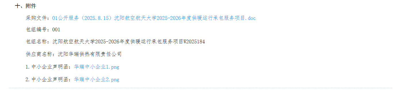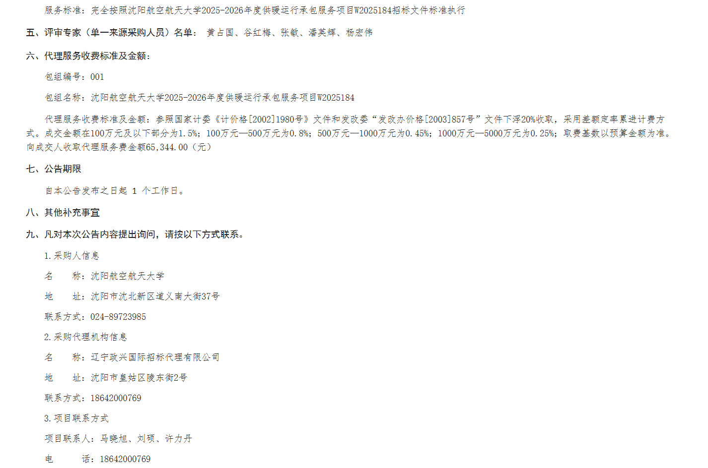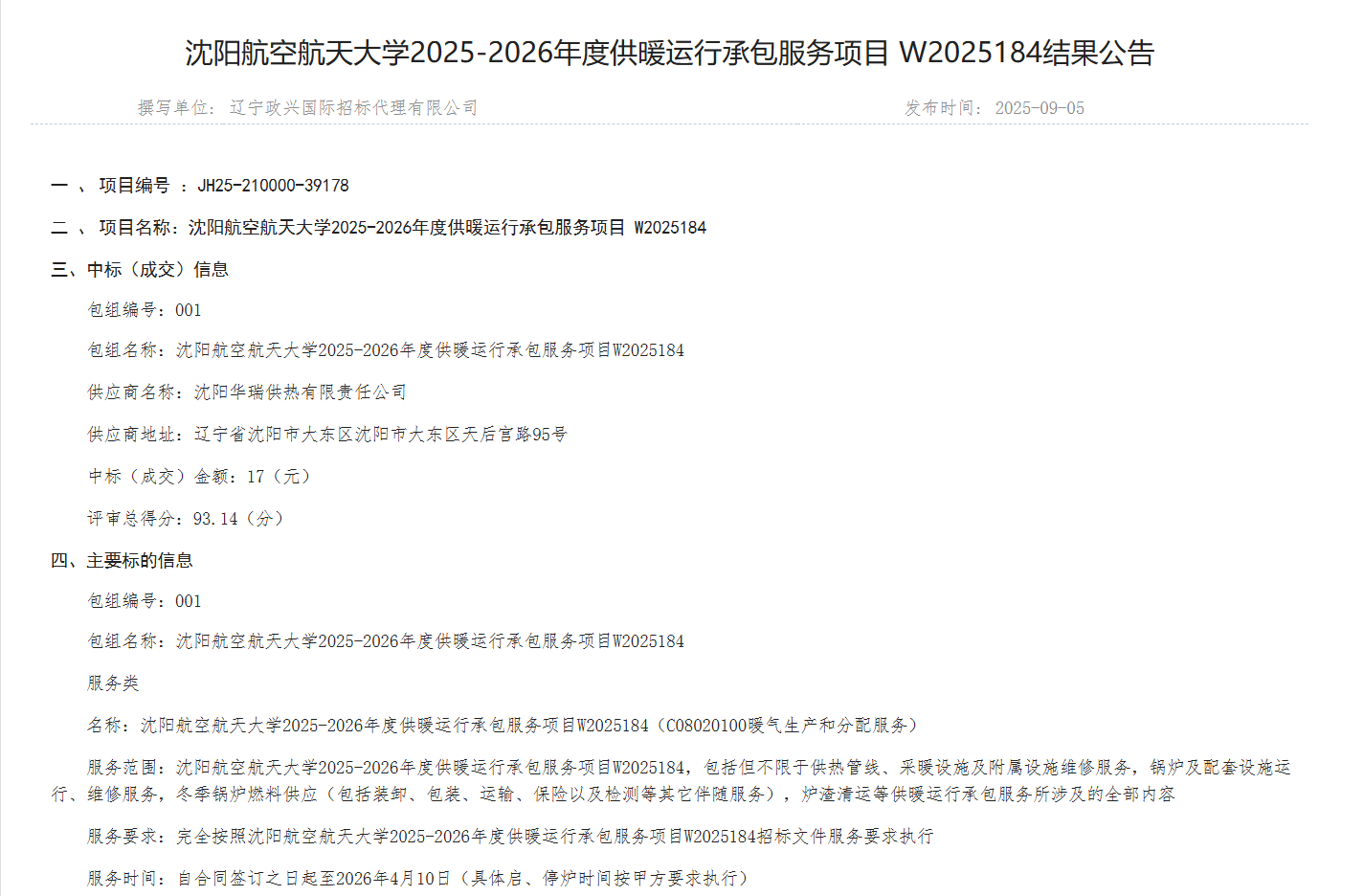 沈航2025-2026年度供暖运行承包服务项目W2025184成交公告(JH25-210000-39178)
