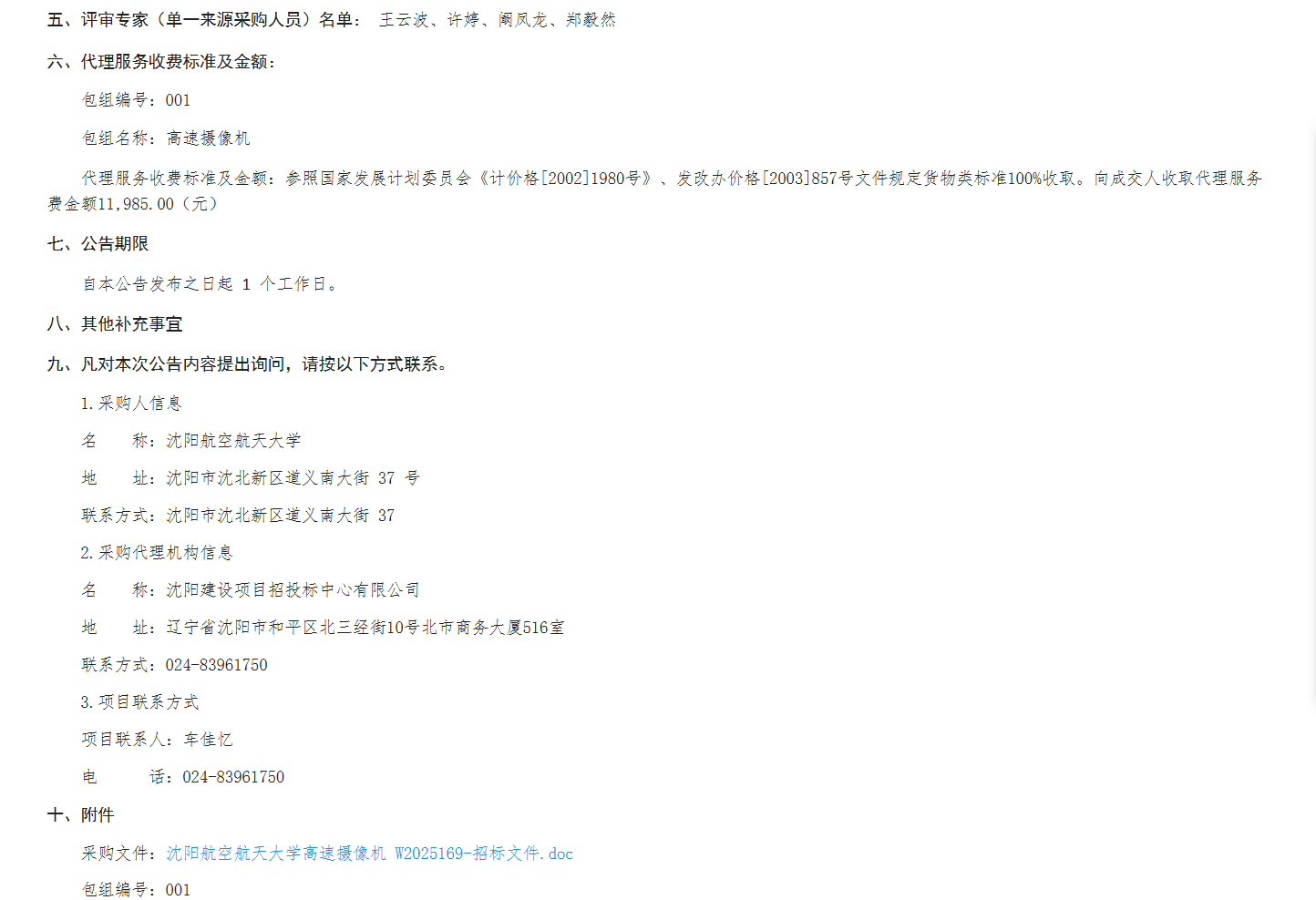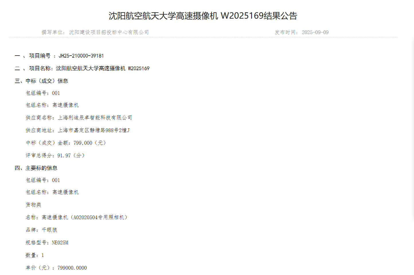 沈航高速摄像机W2025169结果公告(JH25-210000-39181)
