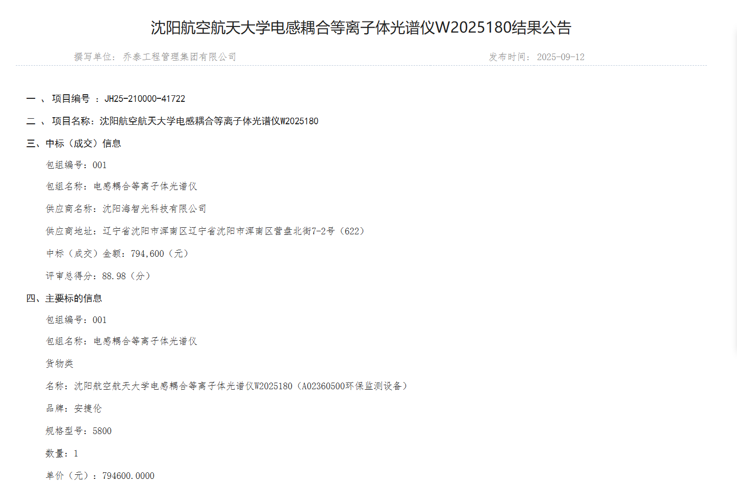 沈航电感耦合等离子体光谱仪W2025180结果公告(JH25-210000-41722)