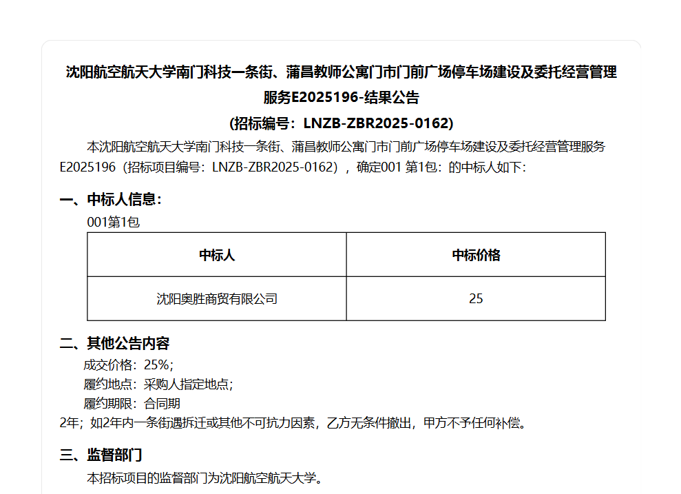 沈航南门科技一条街、蒲昌教师公寓门市门前广场停车场建设及委托经营管理服务项目结果公告(SHWTJTE2025043)