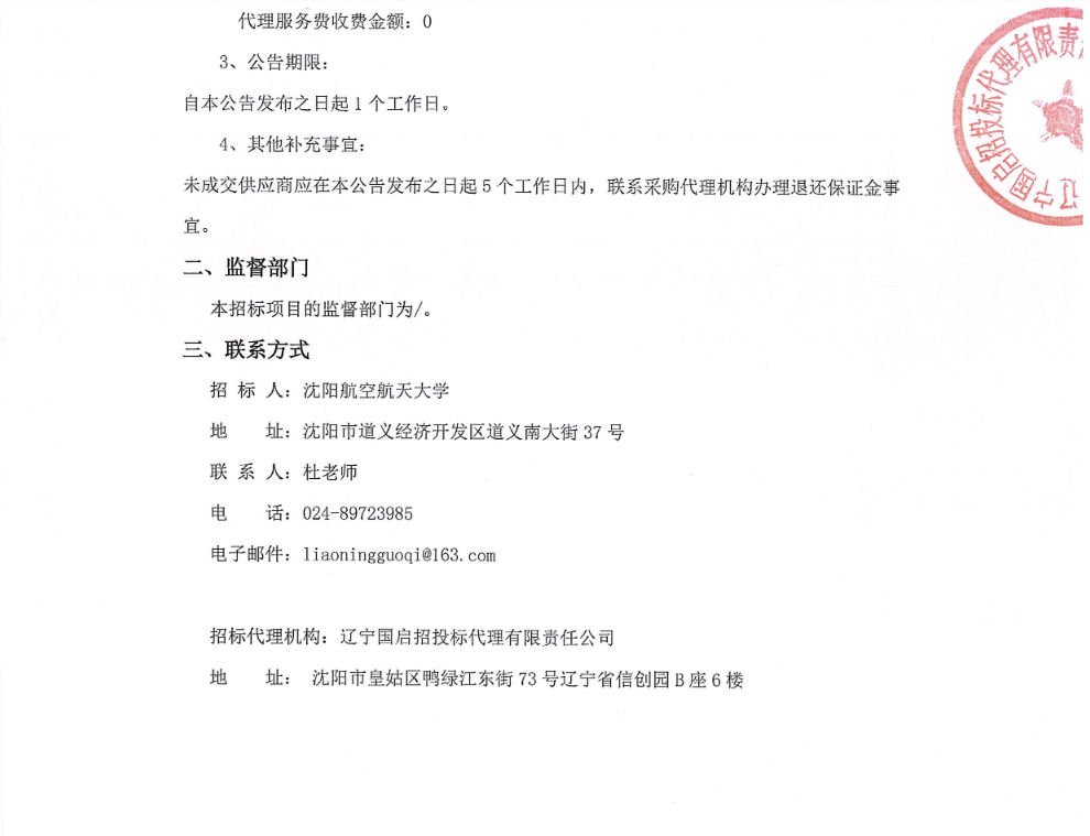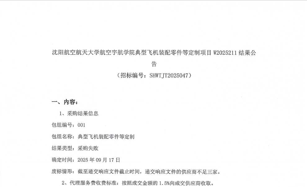 沈航航空宇航学院典型飞机装配零件等定制项目W2025211结果公告(SHWTJT2025047)
