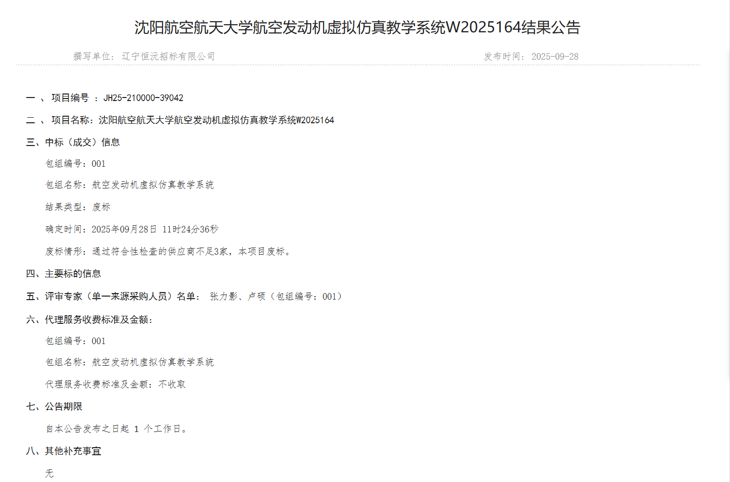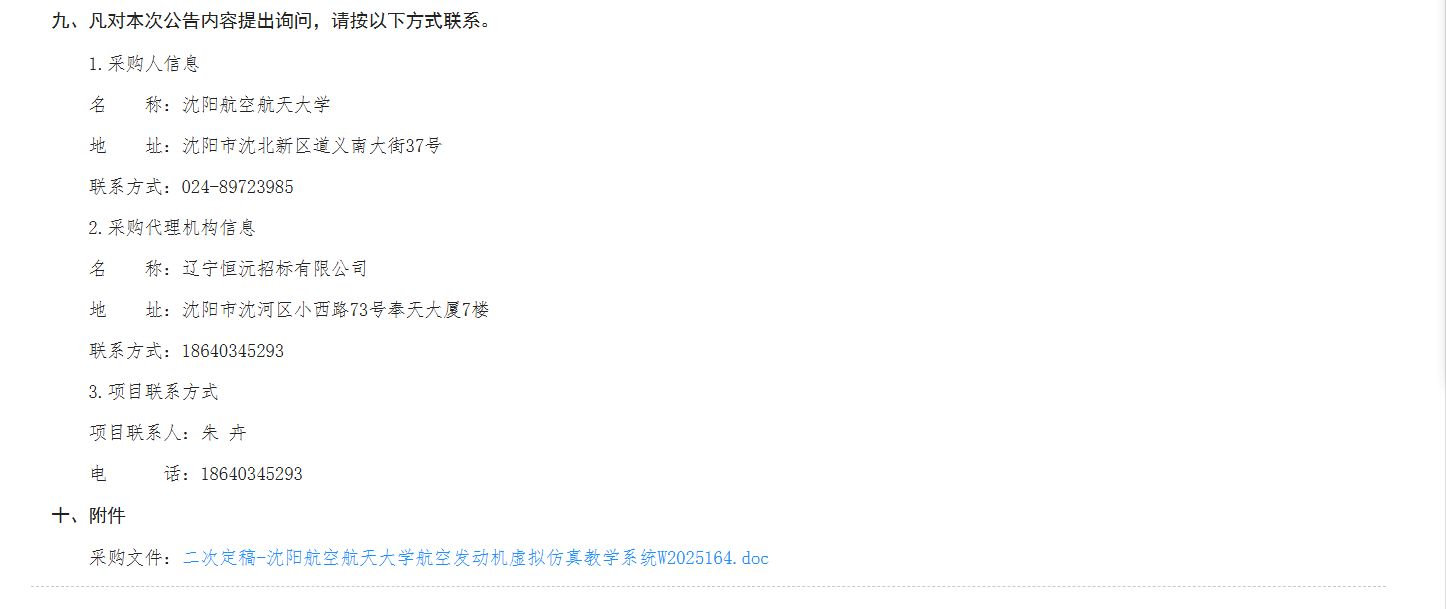 沈航发动机虚拟仿真教学系统W2025164结果公告(J25-210000-39042)