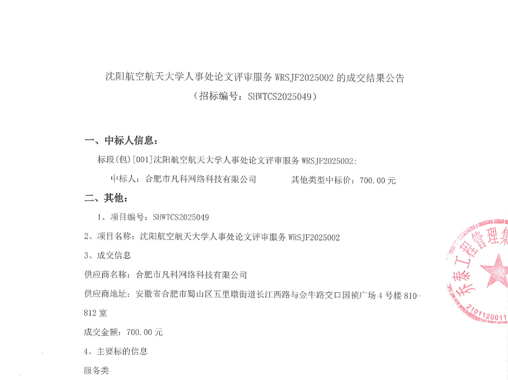 沈航人事处论文评审服务WRSJF2025002成交结果公告(SHWTCS2025049)