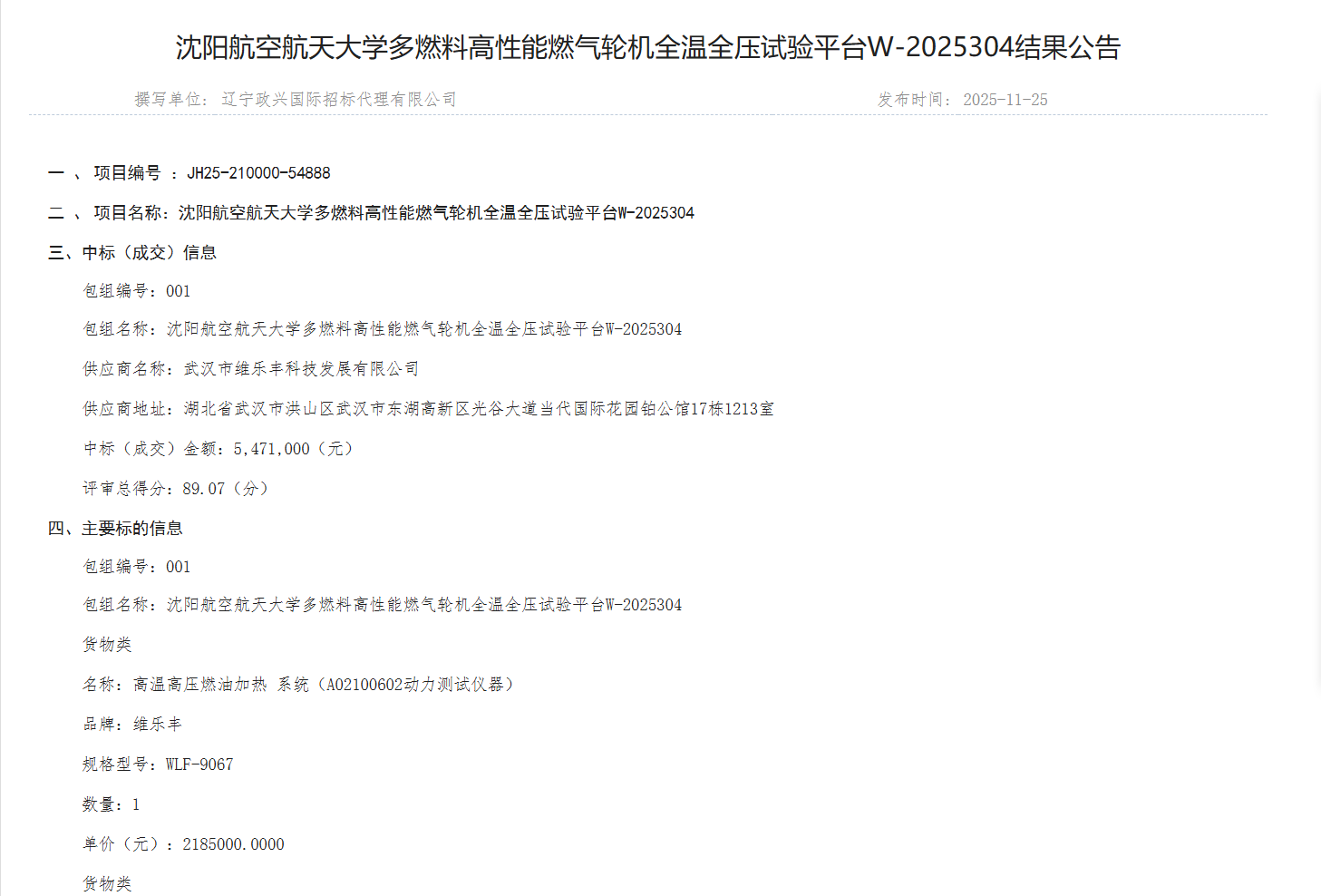 沈航多燃料高性能燃气轮机全温全压试验平台W-2025304结果公告(JH25-210000-54888)