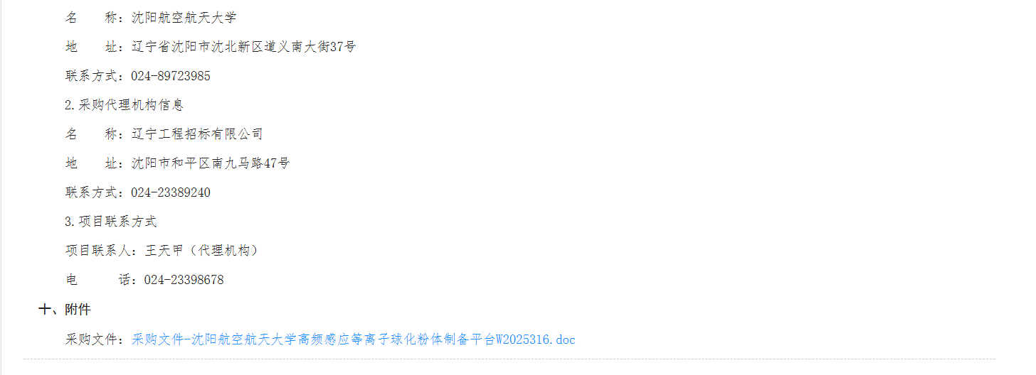 沈航高频感应等离子球化粉体制备平台W2025316(第二次)结果公告(JH25-210000-54898)