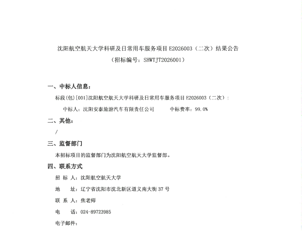 沈航科研及日常用车服务项目E2026003(二次)结果公告(SHWTJT2026001)