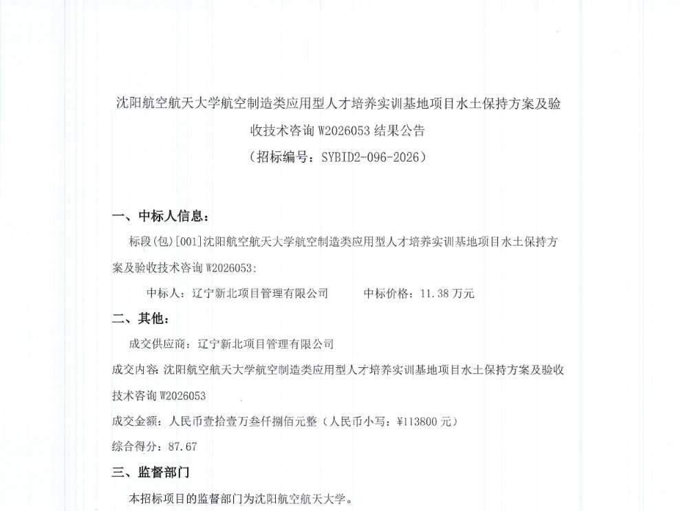 沈航航空制造类应用型人才培养实训基地项目水土保持方案及验收技术咨询W2026053结果公告